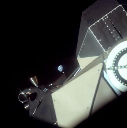 分离后即将坠落大气层的阿波罗13号服务舱,可以看到由于液氧罐发生爆炸导致的严重破损