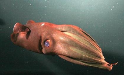 吸血鬼乌贼:这种乌贼非常独特,它独占一种幽灵形目,而且是生活在海洋氧气含量最少水域的唯一乌贼物种。这种乌贼拥有红色眼睛,而且能够借助生物体发光躲避捕食者和捕食。它不仅能借助身体上的生物体发光器官混淆捕食者,而且在受到威胁时会从触手前段喷出一团生物发光粘液,让自己有机会逃离到周围的黑暗中。
