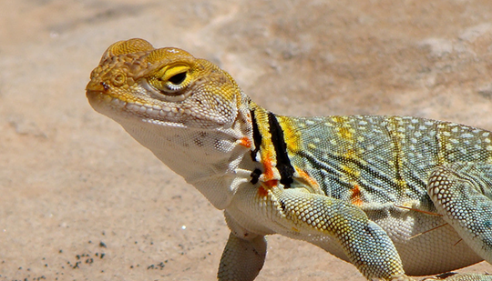 最适合的实验对象就是图画栉蜥(Ctenophorus pictu),这种蜥蜴生活在澳洲南部和中部地区。雄性寿命只有1年,所以它们必须要把握住一生中唯一的交配机会。当交配季节开始时,它们的头会变成黄色、橙色和红色相间,这是类胡萝卜素和另外一种抗氧化成分蝶啶造成的。