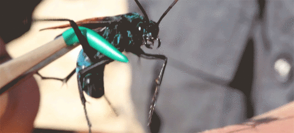 尽管蛛蜂的钉刺凶猛无比,但其实它们还算是满友善的动物,不太会主动攻击人类。再加上拥有亮蓝色外骨骼和橘红色翅膀,是不是还满想摸摸它们的啊?