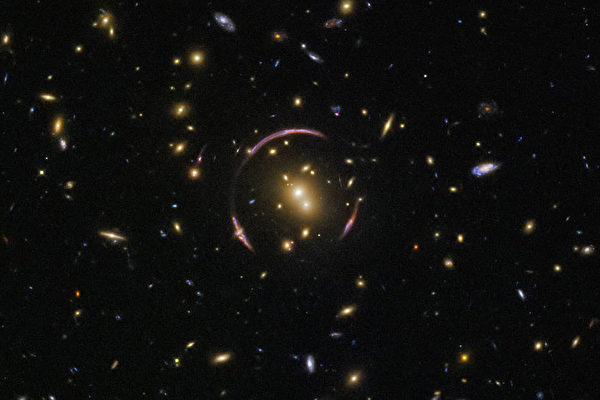 图像中心处是一个名为SDSS J0146-0929的星系团(由数以百万计的星系组成)所产生的引力让周围时空严重扭曲,一道遥远星系的星光刚好从附近穿过,使得星系看上去呈环状。