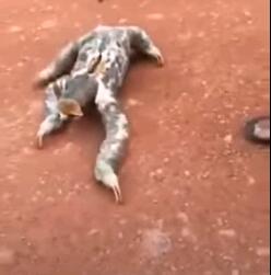 第一段影片中,男子正在展示一只身体上下一样粗、四肢长长的动物,它就像穿了迷彩服,头颈细长,乍看有点像乌龟,男子先在动物身上轻轻抚摸几下,接着将试图爬离马路的动物拖到路中间,最后用手抓起整只动物,但因为该动物从头至尾正面几乎都朝下,无法看清楚真正面目。
