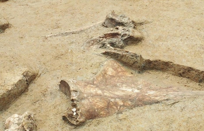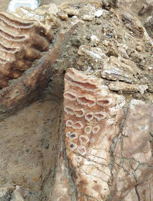 在江苏省泗洪县石集乡桂台村的涵桥水利施工现场发现疑似大型古代动物化石现场,经多日清理,已基本确认了化石的分布和保存情况。据中科院古脊椎动物与古人类研究所同号文教授进行现场考察、细致查看每一块骨骼化石后,认为这是一具保存相当完整的淮河古菱齿象的骨骼化石。据他介绍,该古象骨骼化石距今约五六万年,从臼齿磨痕判断象龄约50岁,正直壮年。