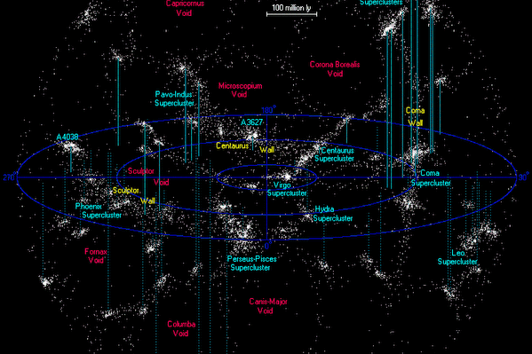 在5亿光年的宇宙范围内的天体结构及空洞示意图。其中白色小点代表可见物质,红色字母显示的为空洞区域。(Richard Powell/公有领域)