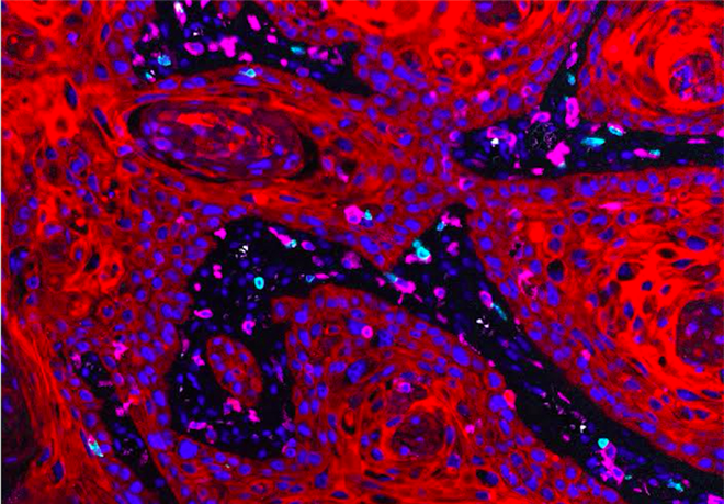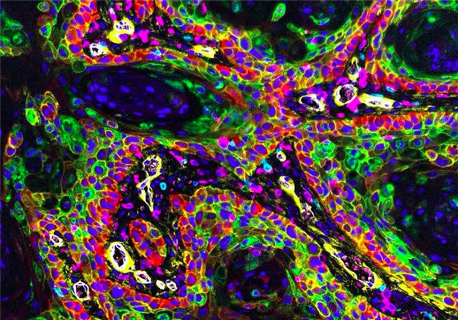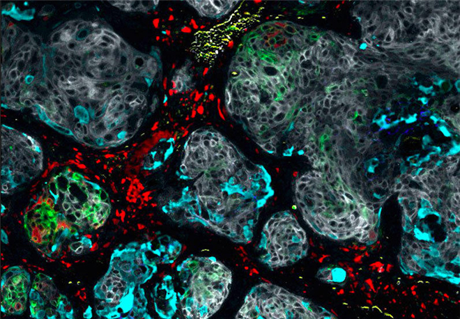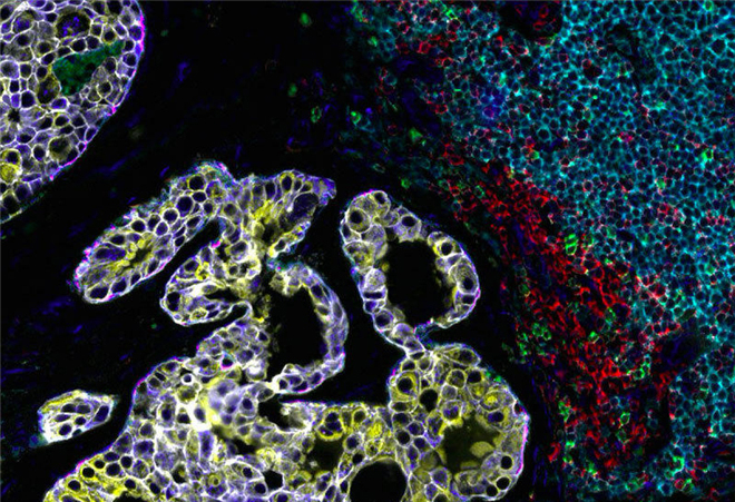 左侧的紫色和金色区域是两种以上与乳腺癌相关的蛋白质。但是在右侧也存在一些相当强大的免疫细胞。这些免疫细胞呈现出红色、绿色和蓝色。大量的免疫细胞可能意味着身体正试图对抗这些新肿瘤。