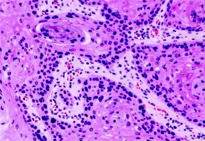 这是标准的着色组织切片样本。它被称为H&E样本,而且被病理学家用于基本的癌症诊断。这份特殊的样本源于患癌的肺部组织。这个样本尚未作出疾病标识,但是病理学家仍然能够通过观察细胞的形状和排列,识别出组织中的癌症特征。如果你仔细观察,每个细胞核都呈现暗紫色,恶性肿瘤细胞块呈现淡粉色,血管中的红血球呈现亮粉红色。