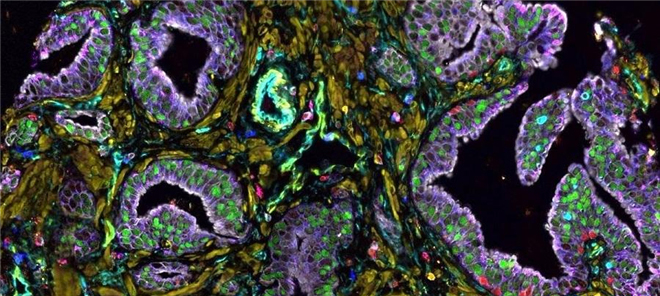 这是在MultiOmyx系统下观察到的前列腺癌组织样本。癌细胞呈现出紫色,而非癌变细胞组织呈现出金黄色。