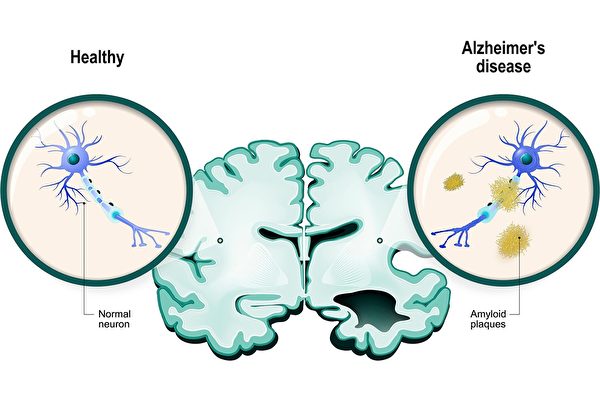 阿兹海默症示意图,左边为正常大脑的神经元,右边为患病的大脑神经元。