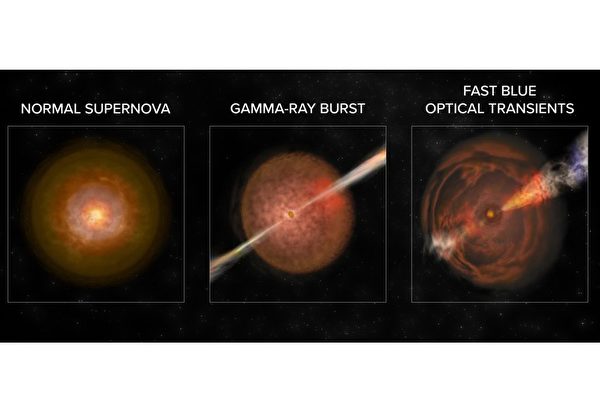科学家发现几个和普通超新星爆炸、快速射电暴有些相似、却又不太一样的事件,把它们归为一类新的瞬态脉冲事件,命名为“蓝光瞬态事件”(FBOTs)。
