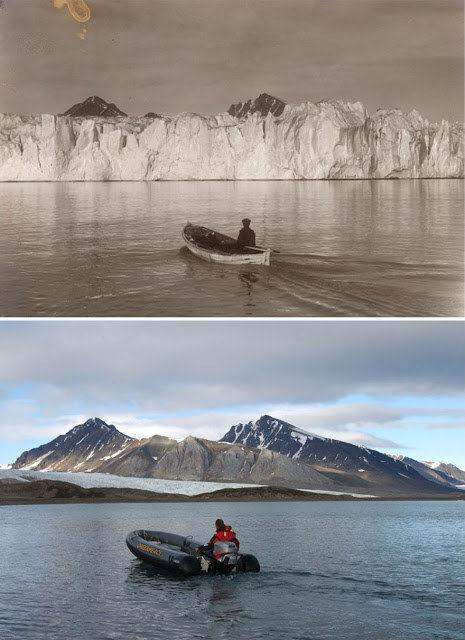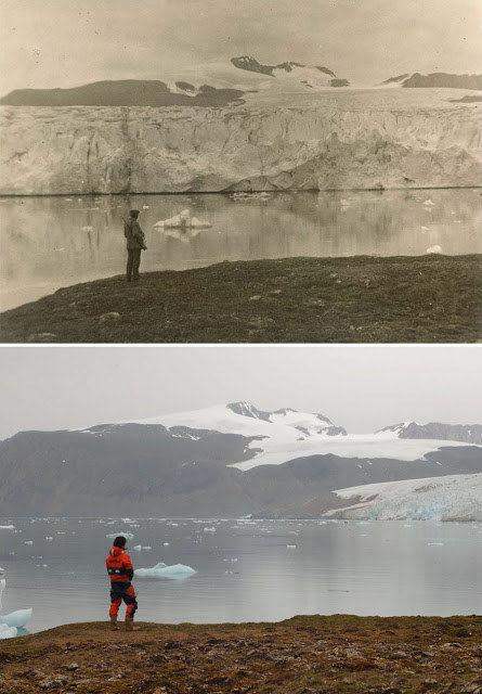 他将现在的大自然照片与20世纪初拍摄的照片进行了比较,让大家明显看到这100多年发生的惊人变化。上方的黑白照片是大约100年前北极的样子。