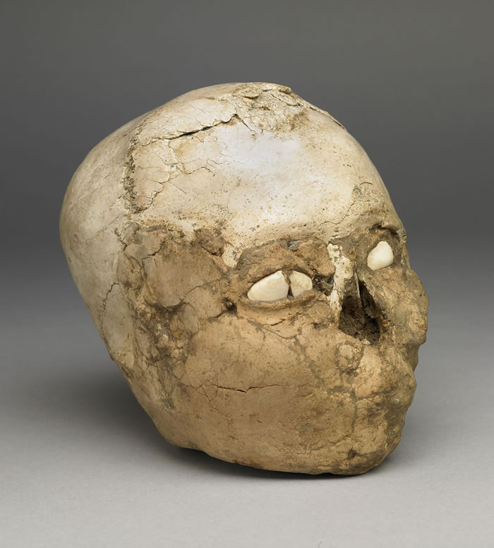 杰里柯头骨内部塞满泥土、外覆石膏以表现脸部特征,贝壳则用来代表死者的双眼。 PHOTOGRAPH COPYRIGHT THE TRUSTEES OF THE BRITISH MUSEUM