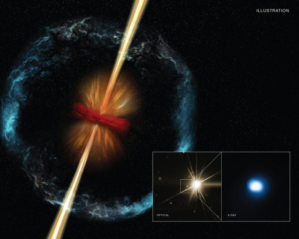 示意图:能力最强的宇宙射线——伽玛射线(黄色亮带),可以摧毁星球上的一切生命。(图片来源:插图:CXC/M. Weiss;右下X-射线图像:NASA/CXC/Univ. of Maryland/E. Troja等人;光学图像:Lowell Observatory’s Discovery Channel Telescope/E. Troja等人)