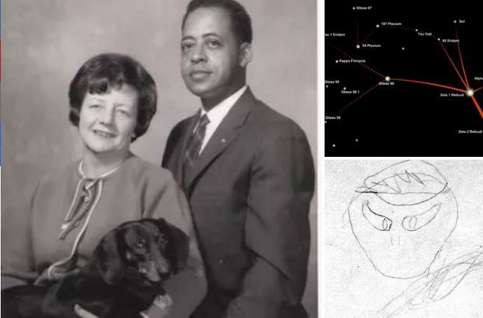 夫妻吓得赶紧回到车上,加速逃离。奇怪的是,他们仿佛遇上鬼打墙,原本4小时的车程,他们开了7小时才到家。他们发现家中的衣物都被撕扯过,贝蒂发现她某件洋装上沾了粉红色的不明粉末。接下来的几天,贝蒂做了奇怪的梦,梦到她的皮肤被抽取样本,一根针头刺进她的肚脐。接着她画出一张星图,说那是外星人给她看的。这对夫妻在当地一向受人敬重,巴尼从事民权运动,贝蒂则是社工,没人相信他们有任何理由编造谎言。