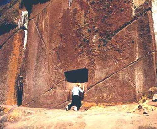哈有马卡的“众神之门”类似蒂瓦纳库的太阳门广场(Puerta Del Sol de Tiwanaku(Tiahuanaco))和附近的五个考古遗址,神奇的是,如果我们在以上所述地点之间画上直线,我们将在中间此区域最神圣的地方之一,的的喀喀湖(Titicaca)的高原中心得到一个奇怪的十字。