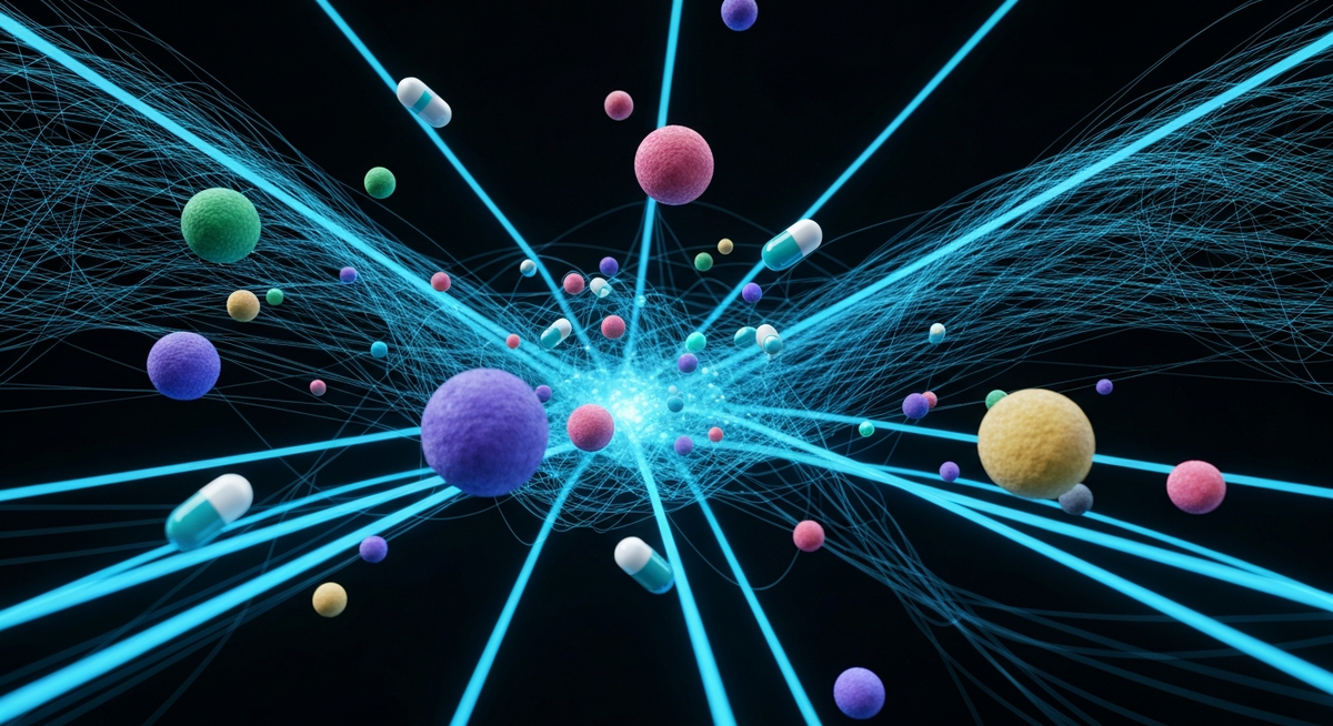 AI 透过演算法在数百万分子中快速筛选候选药物(概念示意图 / AI 生成)