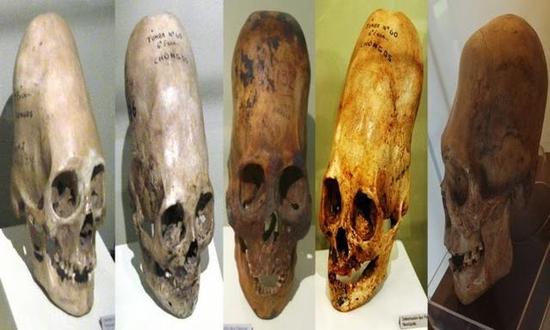 全球不只一种文化有这种拉长的变形头骨风俗,当时 使用的技术是不一样的,也就是说当时造就的颅骨变形也一定不同。在南美洲,有些部落习惯绑住孩童头骨好让头骨变形,最后才导致这种跟正常人类头骨相去甚远的超长形态。