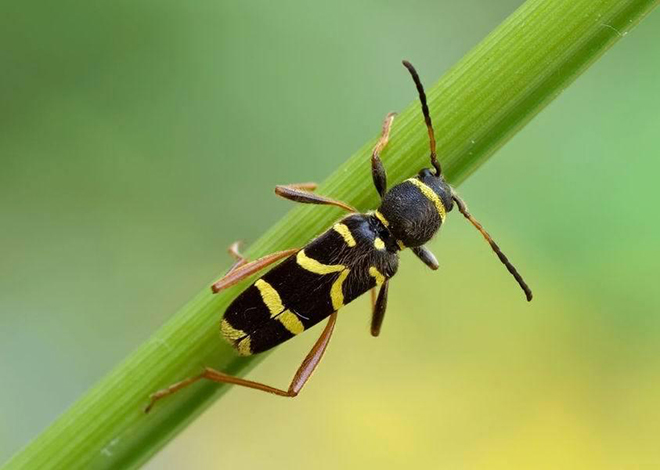 蜂形天牛:蜂形天牛是另一种事实上无害的咀嚼植物昆虫,它们利用类似黄蜂的体色和斑纹抵御任何饥饿的掠食者。它了外貌类似于黄蜂,当它们遇到威胁时还会发出类似黄蜂的嗡嗡声。
