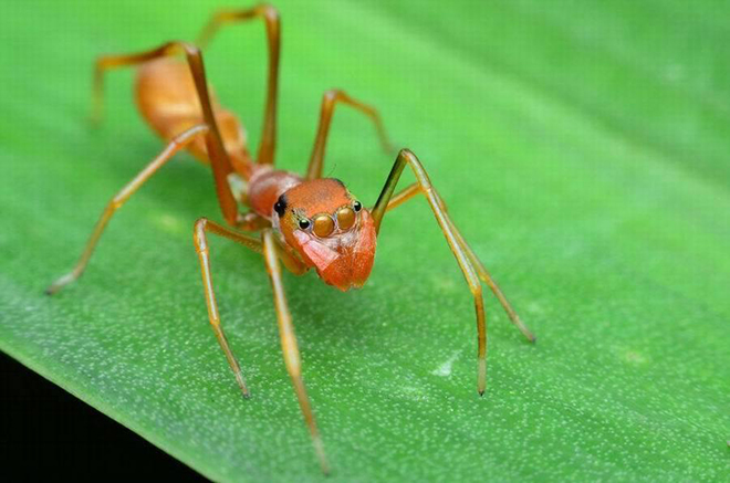 模拟蚂蚁的蜘蛛:从严格意义上讲,它们并非是一种昆虫,而是一种模拟蚂蚁的蜘蛛,它们兼具防御和攻击拟态。一些蜘蛛使用该外貌和化学气味,捕食真实的蚂蚁,其它一些蜘蛛则利用这些特征逃避螳螂等掠食性昆虫,通常情况下螳螂不会吞食蚂蚁。