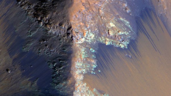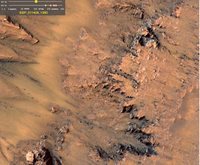 科学家在找到确凿证据之前就已经怀疑火星上存在流动的液态水了,特别是在一些图像显示了火星地貌随季节变化的样子之后。对比这些图片可以观察到水会随着季节变化而极其缓慢的流动,图片显示的是火星上的斜坡从春季到夏季的地貌变化过程。