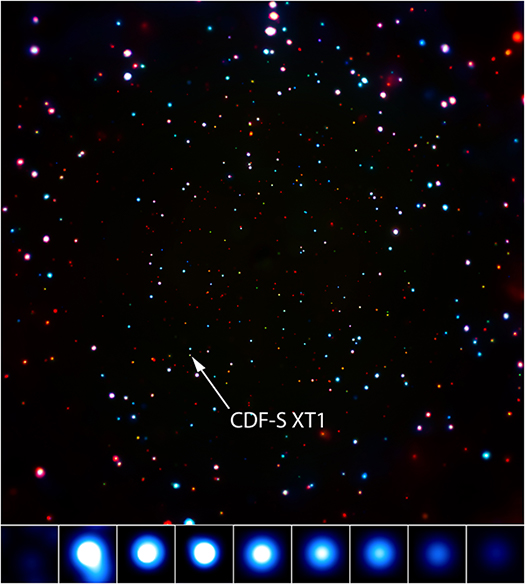 2014年10月在宇宙中出现了一个神秘大爆炸,几分钟内爆炸强度已超过了整个星系所有恒星产生能量的1000位以上,这是距离地球约107亿光年的星系CDF-S XT1,它位于所谓的钱德拉深场南天区之内。。