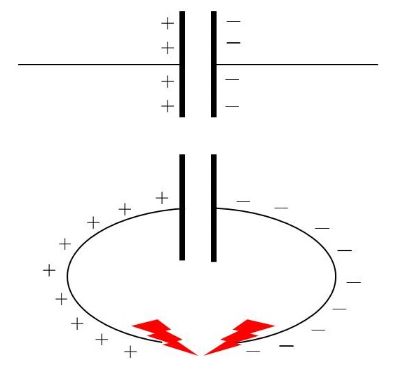 当电容器充饱电时,两个导体分别带有大小相等、符号相反的正负电。由于两者并未接触,所以正负电只会隔空吸引(因此互相“拉住”),而不会彼此中和。然而,如果将两个导体用电线连起来,就等于接通了电路,这时正负电就会顺着回路彼此中和,过程中可能会产生火花。
