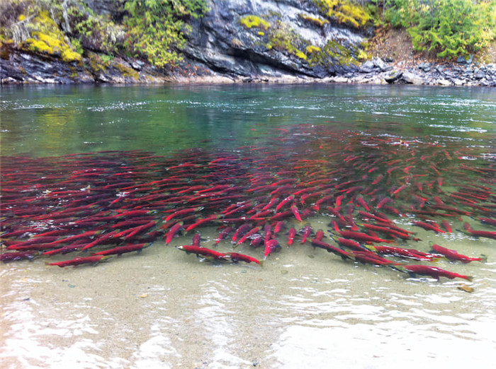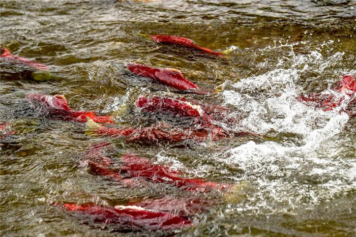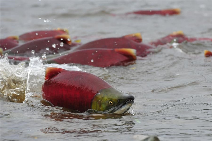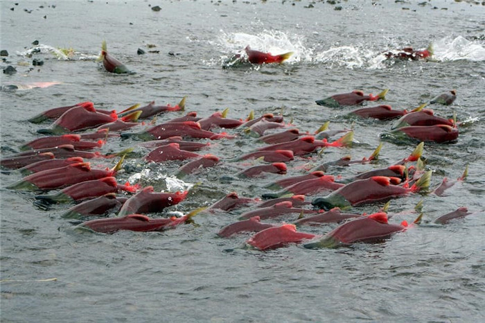 由于鲑鱼的数量太多,看起来水面就像变成了一大片红色,见证著鲑鱼世世代代的生命循环。
