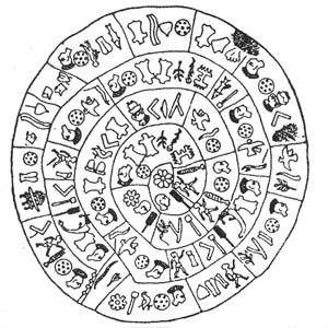 具有约4000年历史的斐斯托斯圆盘,是意大利考古学家1908年7月在希腊克里特岛发现,由黏土所制成圆盘,直径约15厘米、厚度约为1厘米,上面充满了鱼、鸟、昆虫、植物等242个印记,除去重复的图案后,共有42种。欧文斯2014年曾在一公开演说中指出,圆盘上的主要讯息,其实在传达对“母亲”的祈祷,也就是米诺斯文明的生育女神。