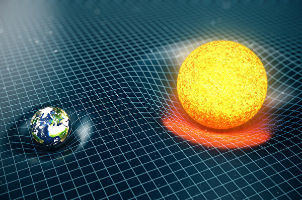 引力理论认为大质量天体会造成周围空间的弯曲。此为空间弯曲示意图。