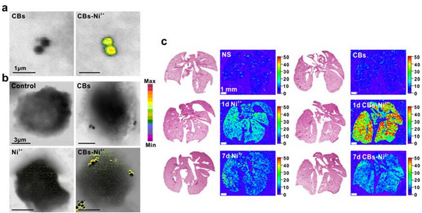 该课题组与上海光源BL08U1A线站紧密合作,利用线站的同步X射线双能吸收衬度成像技术首次观察到碳黑颗粒能吸附并载带大量金属离子进入巨噬细胞,从而破坏了细胞内部的自噬平衡,导致了显著的毒性效应。同时,该课题组利用上海光源BL15U1线站的同步X射线荧光显微成像技术,观察到碳黑-金属相互作用导致大量金属进入肺组织,破坏了肺组织内某些重要生命元素的平衡,并造成肺组织的自噬和溶酶体相关功能的紊乱,导致了显著的呼吸毒性。上海光源先进的X射线显微成像技术,在细胞水平以30-50nm的高分辨率对碳黑颗粒复合物的形成及其和细胞相互作用的过程进行了可视化的研究,在动物水平以微米级的分辨率对该复合物造成肺组织内金属及重要生命元素分布的变化进行了深入研究,为揭示其毒性机制提供了关键证据。