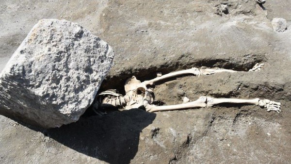 考古学家发现一名年约30岁的男性遗骸,照现场状况研判他应该是逃过了第一波火山喷发,并走在一层厚厚的火山砾上,但是身体却被一块重重的石头给压着。