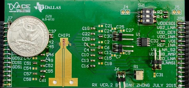 如同在四分之一板右方标示’CHIP1’之下的积体电路,是让电子鼻付得起的关键。UT Dallas