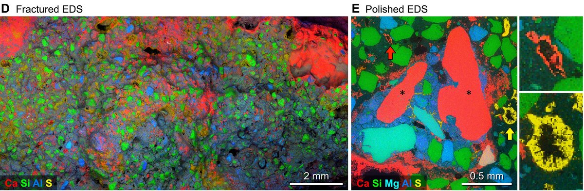 以能量散射X光谱检验普里维侬的墙壁砂浆,会发现富含钙质(红色)的大块石灰颗粒,周遭则有钙、硫(黄)形成的环状自愈痕迹。Source: