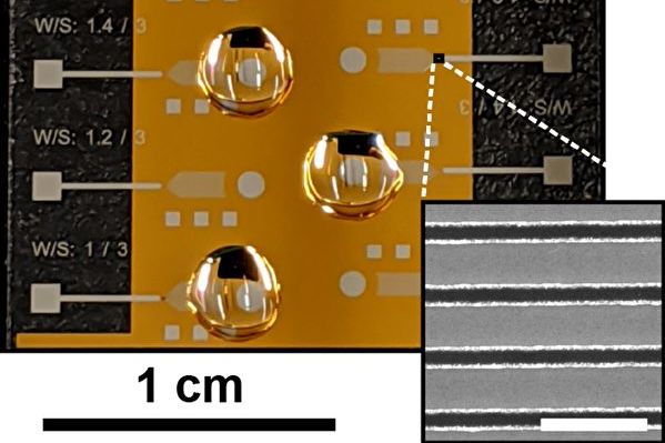科学家在大约2厘米见方的芯片上,利用液体张力把液滴拉开,并结合微型检测通道技术,发明了一种新型在家即可完成的快捷方便的医疗检测设备。图片显示的是芯片上的液滴及微通道。(Laboratory of Nanostructures and Biosensing, University of Minnesota)