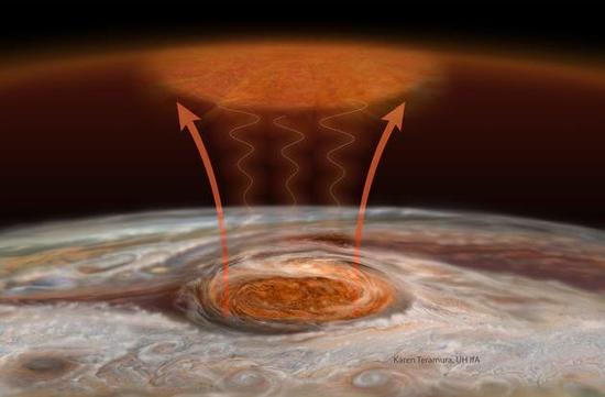 木星本身自转速度很快,只需要10个小时即可完成一次自转。研究团队成员、波士顿大学太空物理研究中心科学家卢克-摩尔博士认为,“大红斑可能就是极好的能量来源,可以加热木星上层大气层。但是,我们还没有确切的证据证明它能够对高海拔空间的大气层产生实际影响。”