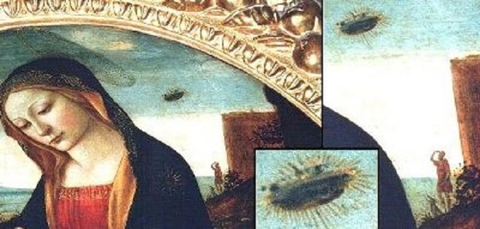 另一幅我们认为非常有趣的作品是由Carlo Crivelli所画的“报喜 (The Annunciation)”。在他的画作中有几个脱颖而出的物体。特别是在天空中有着一个发出了神秘光的神秘物体。