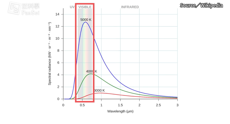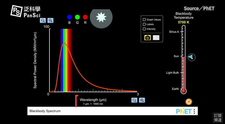 在画面中,有彩虹背景的部分,代表可见光的范围,当黑体的温度越高,发出的电磁辐射,在可见光部分越偏冷色系。当我们在购买灯泡的时候,会在包装上看到色温标示,就是由此而来。所以,如果你想要温暖一点的光线,就要购买色温较低,约两、三千 K 左右的灯泡。