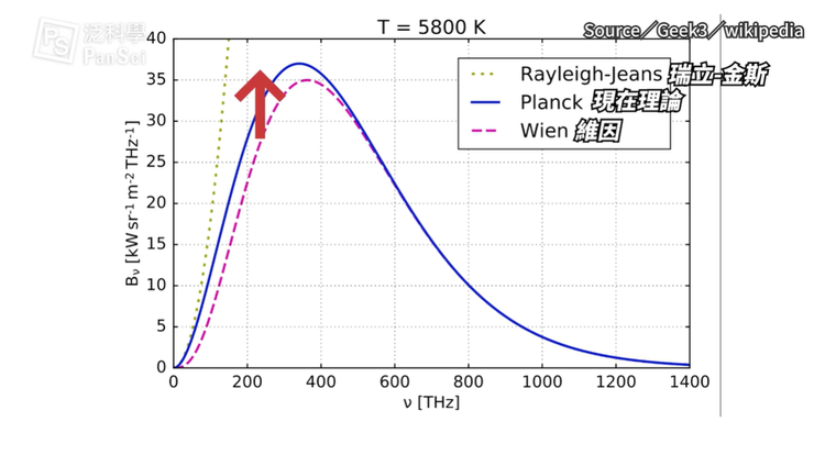 这个基本单位能量写成 E=hν,和电磁辐射的频率 ν 成正比,比例常数 h 则称为普朗克常数。换言之,黑体辐射出来的能量,以hν为基本单位、是一个个可数的“量”加起来的,也就是能量被“量子化”了。