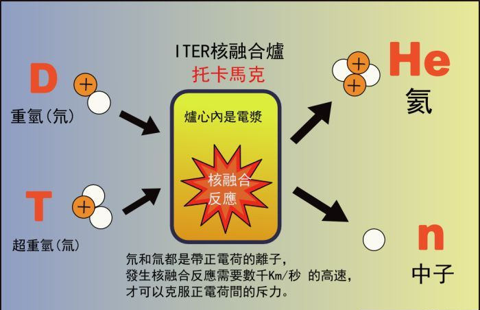 如果我们把氘(质子加上一个中子)然后增加能量跟一些氚(质子加上两个中子)挤压再一起,它将混合变成氦(两个质子和两个中子)。 最后一个中子会跑掉。