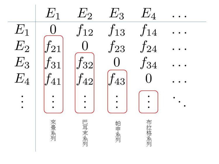 至于为什么物理量(例如位置、动量)以矩阵形式出现,则是一件很难解释的事。我们只能简单地说,原因可追溯到海森堡只允许“可观测的物理量”出现于计算中。就氢原子而言,最典型的可观测量就是光谱频率,而这些频率都源自两两能阶的差,因此最自然的表现方式就是排成矩阵,例如f21这个元素代表“从第二阶降到第一阶的发射光谱频率”,f23代表“从第二阶升到第三阶的吸收光谱频率”。