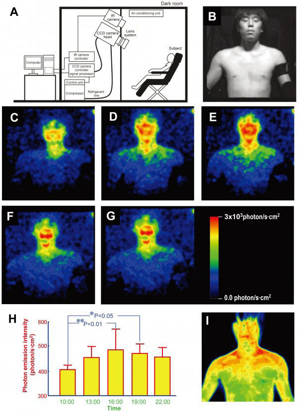 该假设的进一步证据是动物的生物荧光与代谢速率有关。研究人员们认为这种光可能与身体的生物钟有关系。因此当傍晚我们燃烧最多能量的时候,我们整个人就会变得最亮。