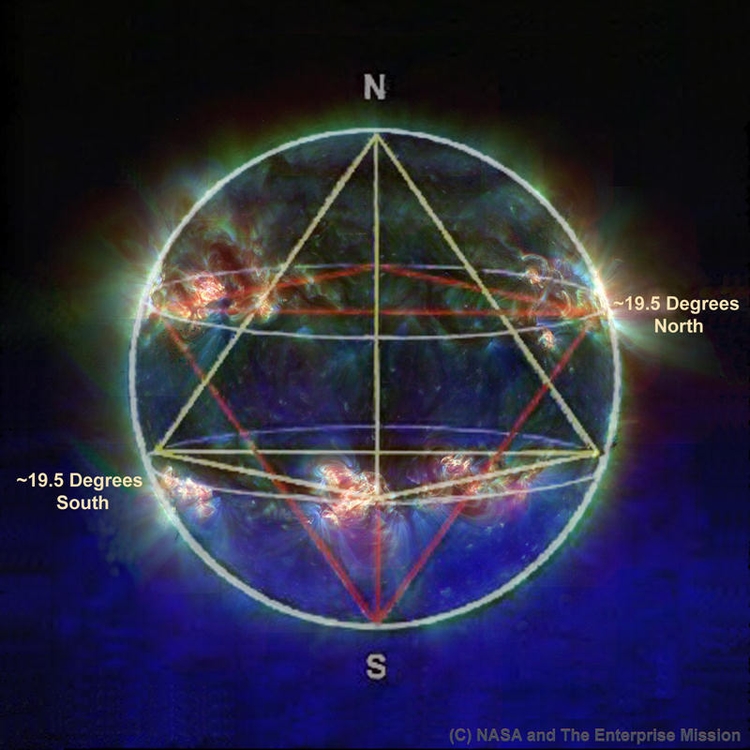 13. 放在一个球形中的星四面体(tetrahedral),顶点会触碰到球形表面,当一个顶点定位在北极或南极,这顶点的纬度就是北纬和南纬19.5度。