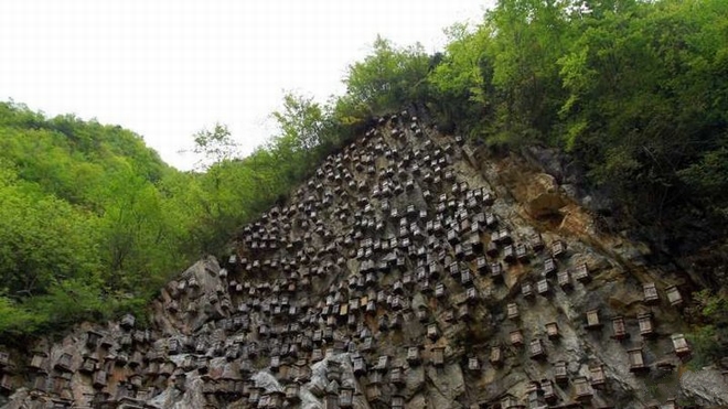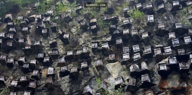 ▼她靠近之后,才发现这些棺木里传出熟悉的蜜蜂嗡嗡声响,得知这是一个个蜂巢!但为什么要在这么荒凉又陡峭的地方饲养蜜蜂呢?