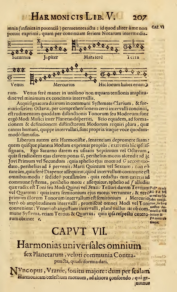 至于行星彼此间的音高关系,克卜勒的算法相当复杂,但大致可说是由第三定律决定:行星距离太阳越远,公转时间越长,角速度就越小,它在五线谱的位置也就越低。因此若用声乐来比喻,土星和木星是男低音,而水星当然是女高音。