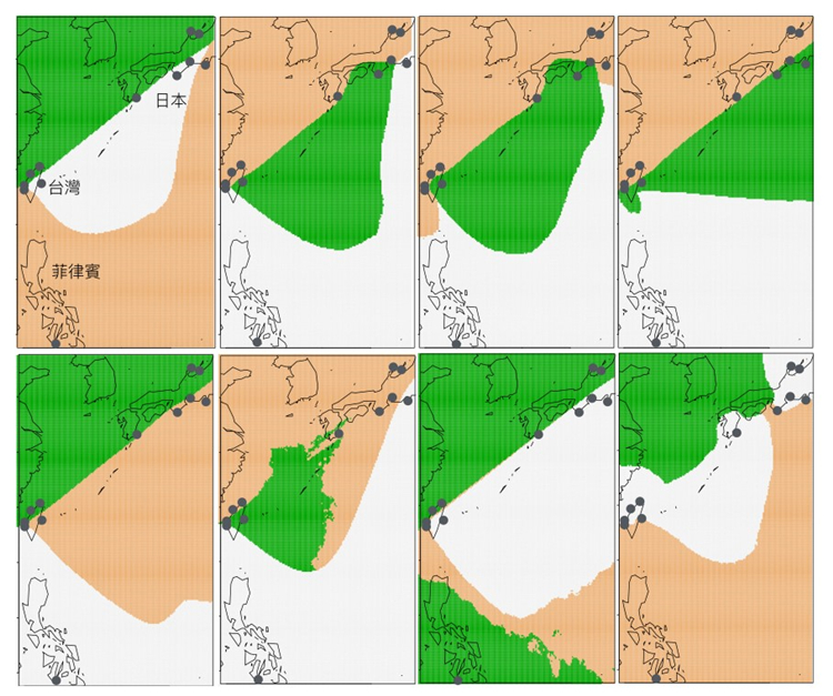 图三:以分子遗传分析软件 Geneland 归纳出瓶鼻海豚在西北太平洋沿海 (日本-台湾-菲律宾) 最有可能的八种形式。图中灰点为海豚标本采集地,不同颜色区块为 Geneland 预测之各族群分布范围。之所以预测结果会多达八种形式,是因为部分样本的族群归属相当暧昧;但是总体来说大抵均呈现台湾-日本东西岸分属不同族群的结构。