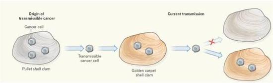 图1 癌细胞可在不同贝类物种之间传播。在金蛤仔中发生的可传播癌症起源于另一个物种—小鸡蛤蜊。虽然两种蛤类共用一个栖息地,但目前仅在金蛤仔中检测到癌细胞,表明小鸡蛤蜊获得了抵抗这种癌症“感染”的能力。