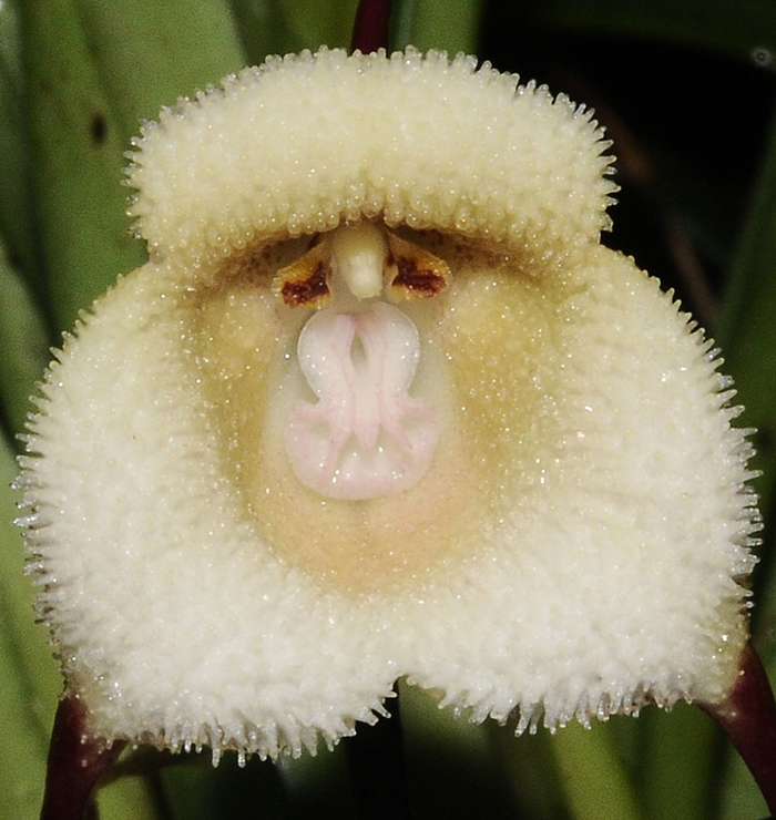 这种兰花上像“猴脸”和“猴嘴”的部分是小龙兰的唇瓣,像三片大花瓣一样的部分实际上是萼片,而似猴子额头和鼻子的部分则是蕊和柱。