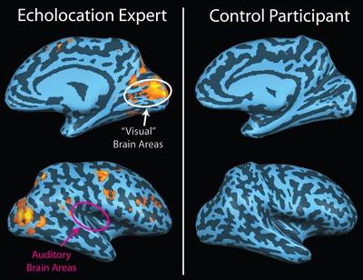 就盲人受试者而言,回音反而会触动他未使用的视觉皮质,这表示当弹舌音在虚拟的墙间回弹时,让回音形象化了。