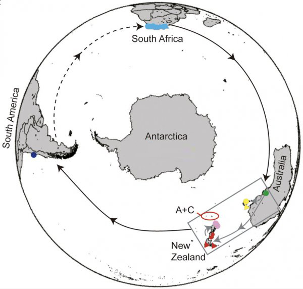 科学家们将雾带蜘蛛的进化分裂精确推算到第三纪中新世,距今不到1000万年,冈瓦纳大陆早已分散开来,这证明蜘蛛的广泛分布并非是被动参与的。相反,它们的祖先主动出击,乘坐漂浮的碎片顺着南极绕极流向东航行。这些蜘蛛可以几个月不吃不喝。它们首先来到非洲,在这里进化出现代品种,接着又投入大海的怀抱,抵达了澳洲和新西兰,兜兜转转最终又回到了南美,虽然样貌发生了些许变化,却更加强壮坚实了。