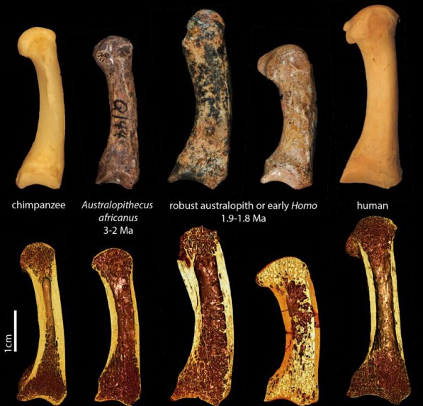 进化出直的手骨,同时配合拇指相对和变长的进化,可使我们的祖先更容易用他们的手指握住物体。