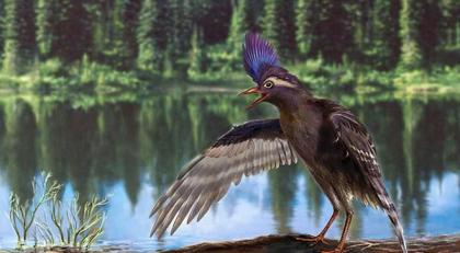 目前,考古学家在中国河北省丰宁县四岔口盆地挖掘发现一种白垩纪早期远古鸟类化石,其历史可追溯至1.3亿年前,它是迄今发现最早的今鸟型鸟类物种,比之前发现最早的今鸟型鸟类生存时间早500万年。如图所示,它长着扇形尾羽,翅膀末端有融合骨骼,头部长着类似朋克族的毛发。